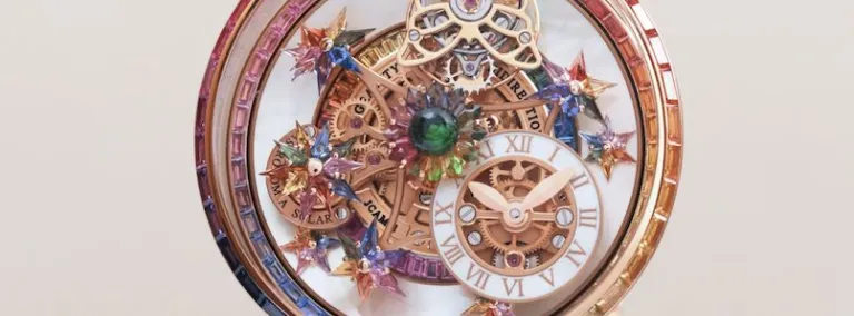 En 2019, les Fleurs de Jardin ont été officiellement préselectionnées parmi des centaines de garde-temps féminins pour figurer dans la catégorie Ladies Complication du GPHG, l'équivalent des " Oscars " pour l'horlogerie, ce qui illustre combien cette création représente un événement important en horlogerie. Il a fallu relever de nombreux défis pour réaliser ce petit chef-d'oeuvre, d'abord en trouvant les pierres précieuses de la bonne couleur. Jugez plutôt : la lunette en or rose 18 carats de 42,5 mm du Rainbow comporte pas moins de 40 saphirs arc-en-ciel, et la bague intérieure 48 saphirs arc-en-ciel, tandis que le dessus du mouvement s'orne d'une Tsavorite verte de 288 facettes de coupe Jacob. La beauté et le luxe portés à leur summum, pour un garde de temps hautement féminin en version limitée à 101 pièces.